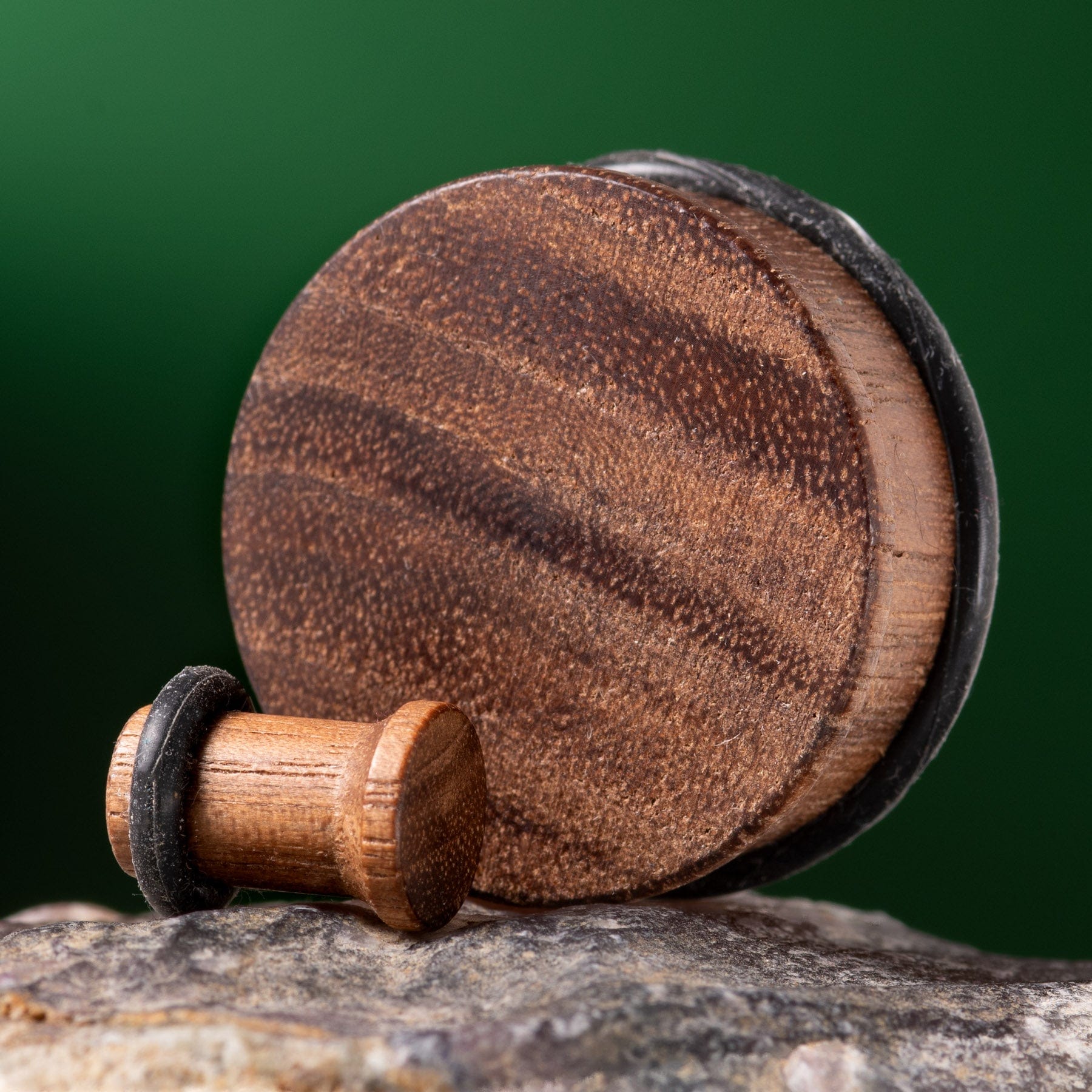 The single flare plugs, crafted from the naturally rich and dark brown black walnut wood with a medium grain, are not only prized for their stunning color and texture but also for their lightweight design, ensuring they don't interfere with daily activities. The simplicity of the single flare style allows for effortless insertion and removal. These untreated plugs are best maintained with Jojoba or Vitamin E oil, which conditions the wood. For a visual comparison, additional photos illustrate the distinction between the natural state of the plugs and their appearance after oil conditioning.