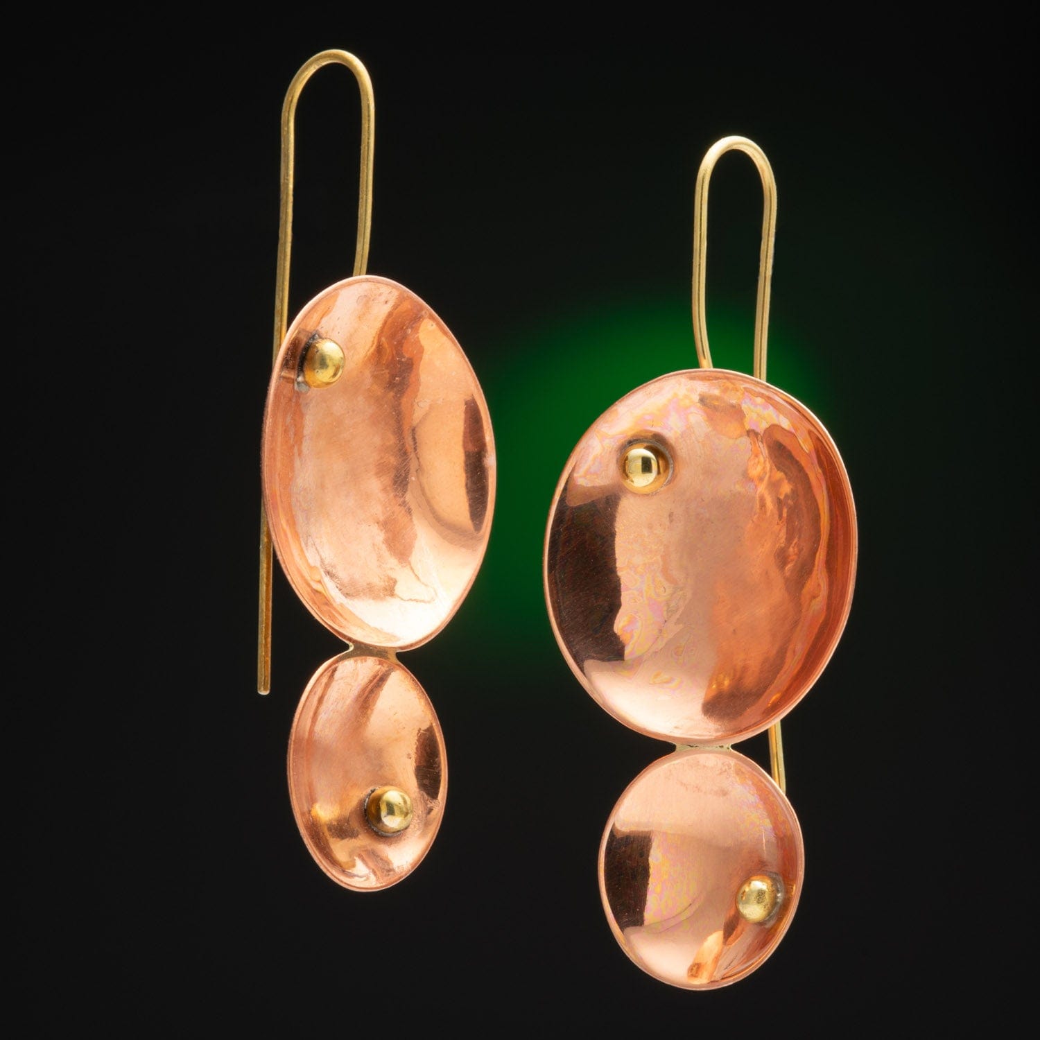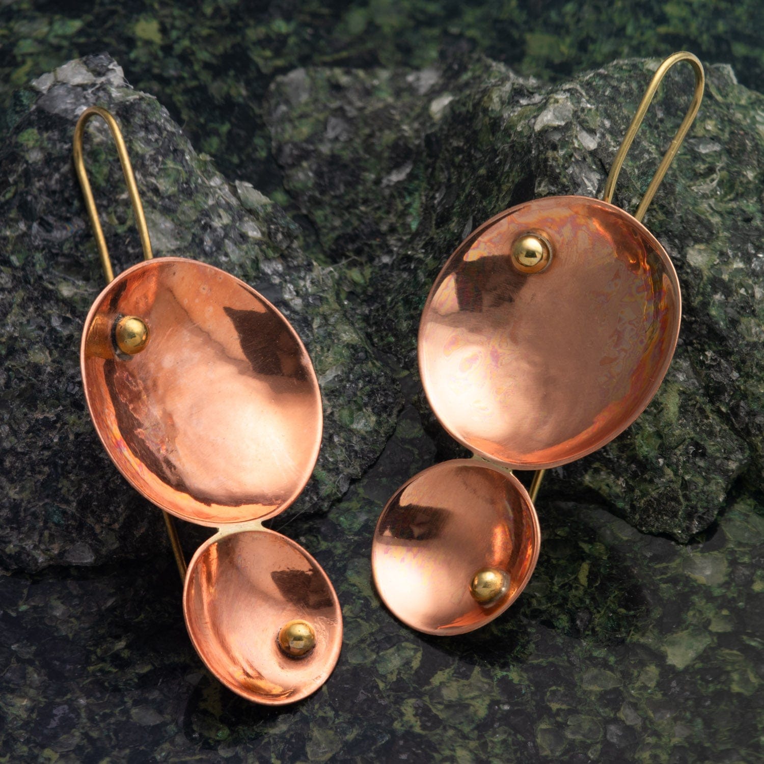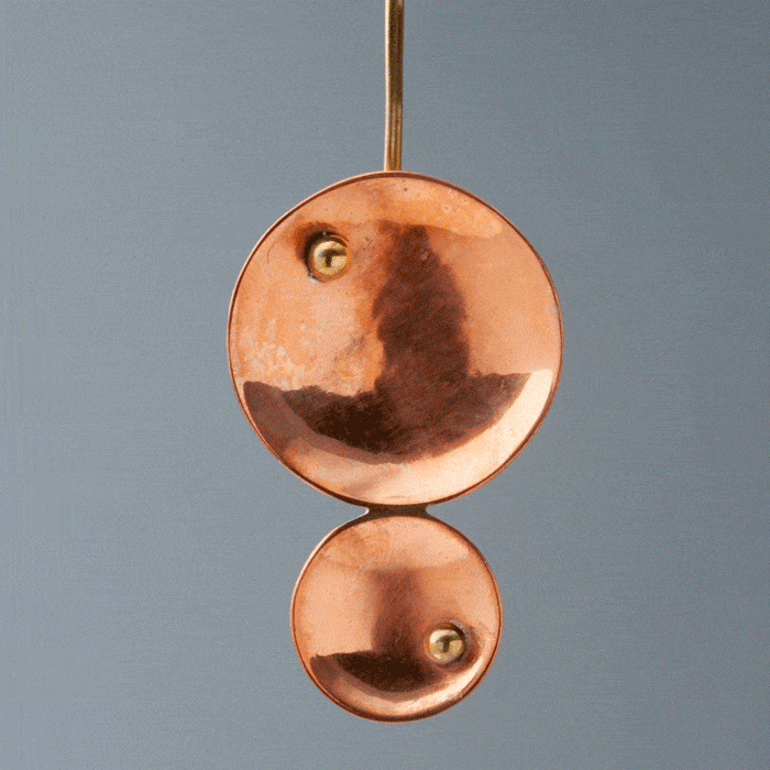 Channel elemental allure with these pin earrings, where glowing copper discs nestle gracefully on slender brass wires. The doubled-up, hand-hammered discs catch the light with every move, mixing metallic warmth and shine for a look equal parts ancient and avant-garde.