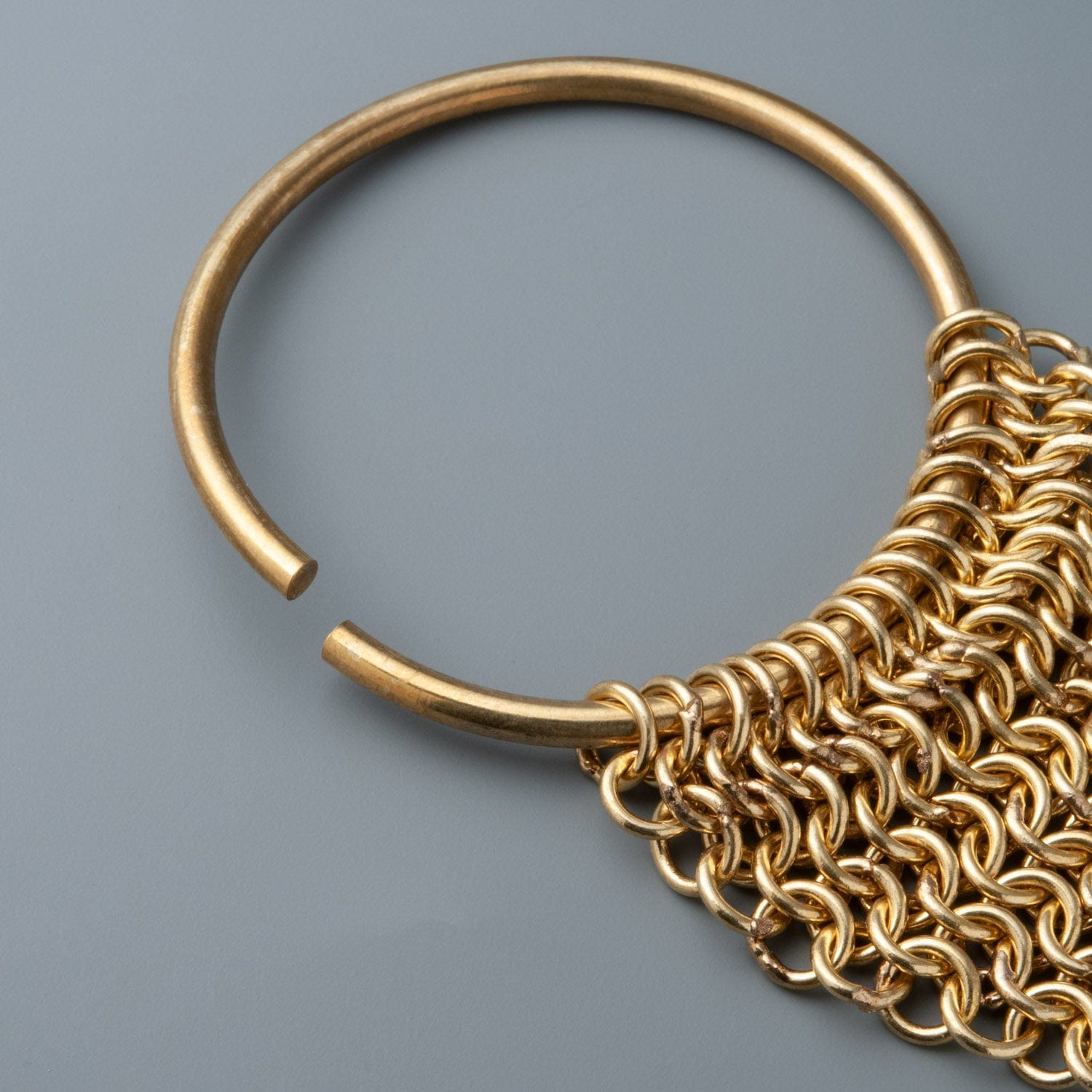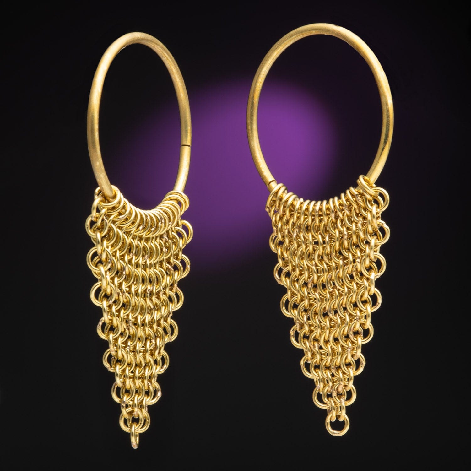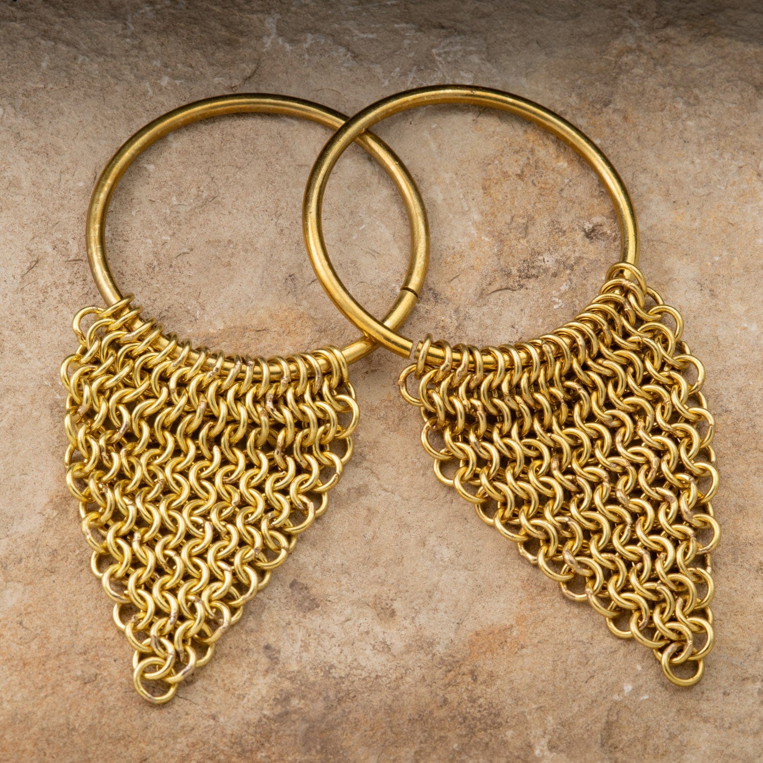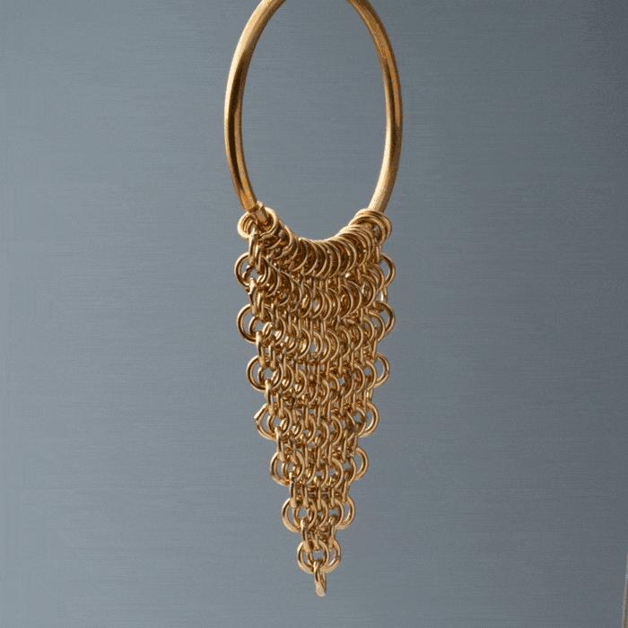 Add a little rhythm to your look with these brass hoop hangers, finished with a triangular fringe of handmade chain mail. The warm, golden brass captures light and throws it right back, turning every head as you dance, walk, or just turn your head.