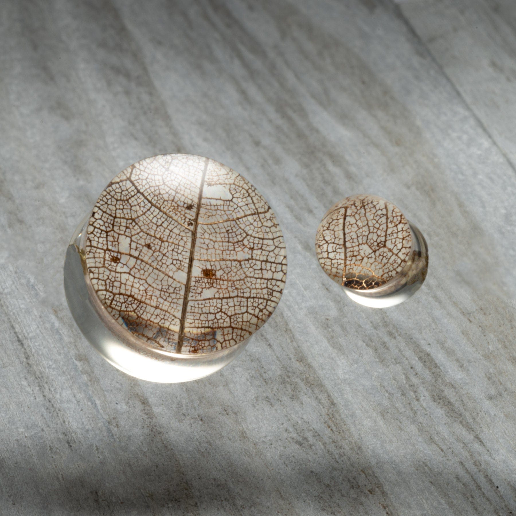 Bring the breathtaking beauty of nature to your stretched ears with these epoxy plugs, each featuring a delicate skeleton leaf preserved in crystal-clear resin. The fine, web-like veins stand out against the smooth background, creating a subtle yet stunning pattern you'll find yourself admiring up close.