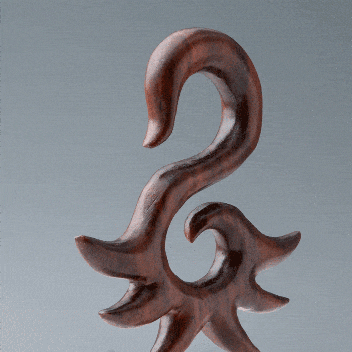 Unleash your wild side with these hand-carved Narra wood hangers, featuring an eye-catching feather-inspired silhouette. Each pair is meticulously crafted from natural narra wood, celebrated for its rich, reddish-brown tones and beautiful grain patterns that make every piece unique. The swirling “S” shape and dynamic, spiked edges add a bold, artistic flair—perfect for anyone looking to make a statement with their stretched ears.